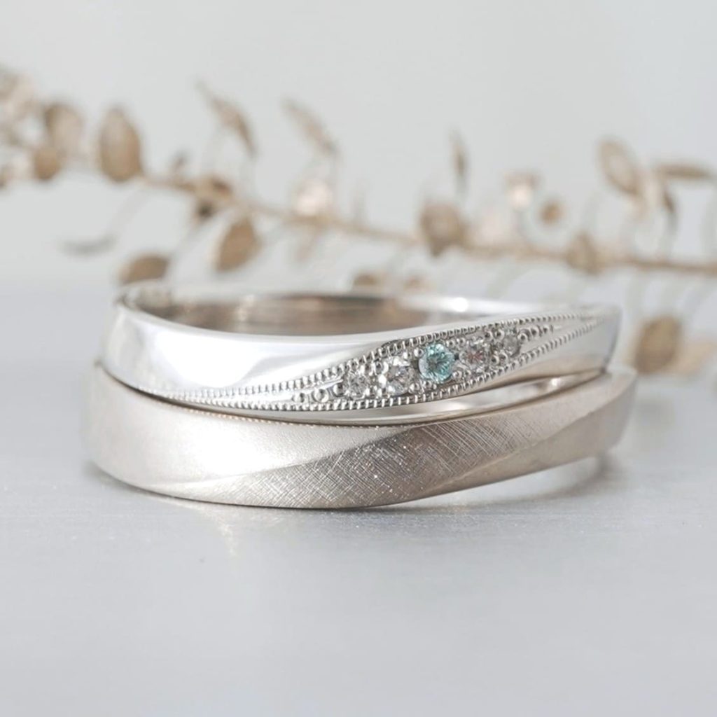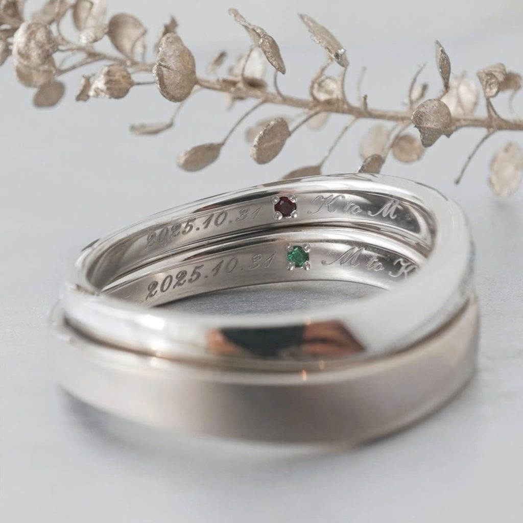 リングの内側には、大切な記念日とイニシャルの刻印。そしてその間には、お互いの誕生石が留められており、見えない部分にも二人の絆を感じさせる演出が施されています。