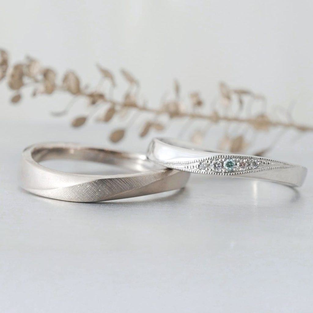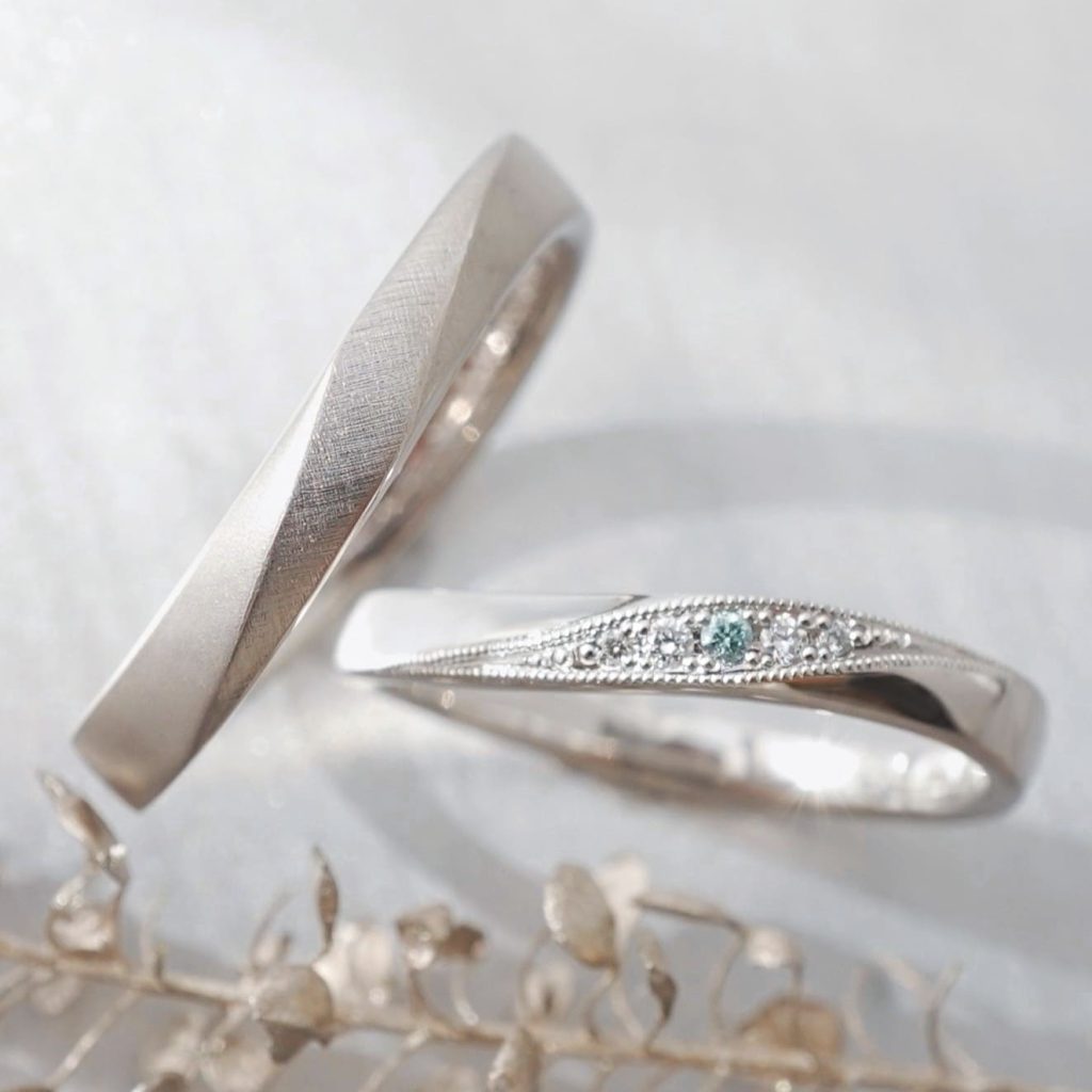 - レディース: プラチナ950。気品ある白色の輝きを放ちます。