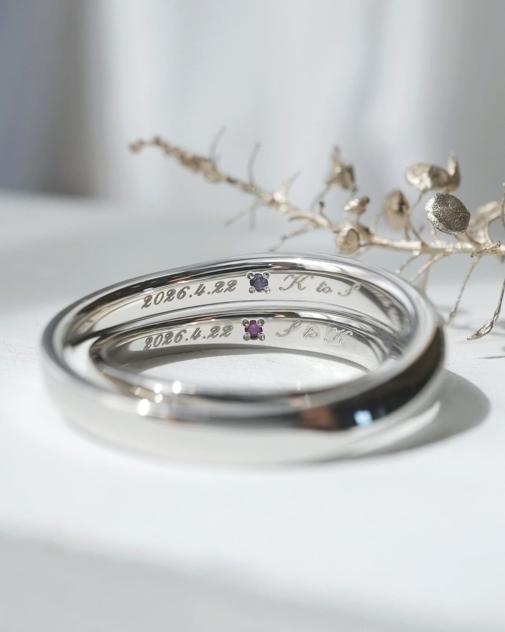 記念日とイニシャルの間にはアメジストとルビー留め。