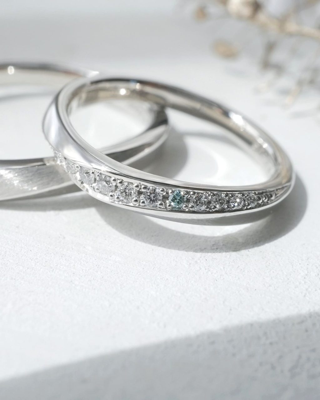 1石ワンポイントにアイスブルーダイヤモンドを留めています。
