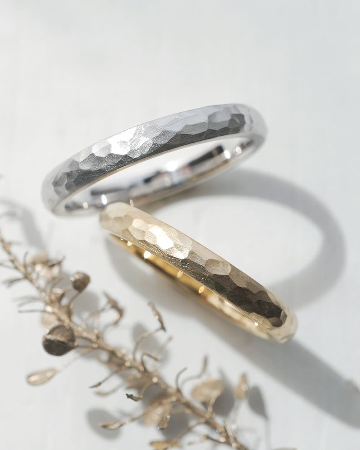工房に響く金槌の音。 その音が止まった時に指輪に刻まれる、 手仕事の証を名前にしました。 こちらは槌目スモールサイズ