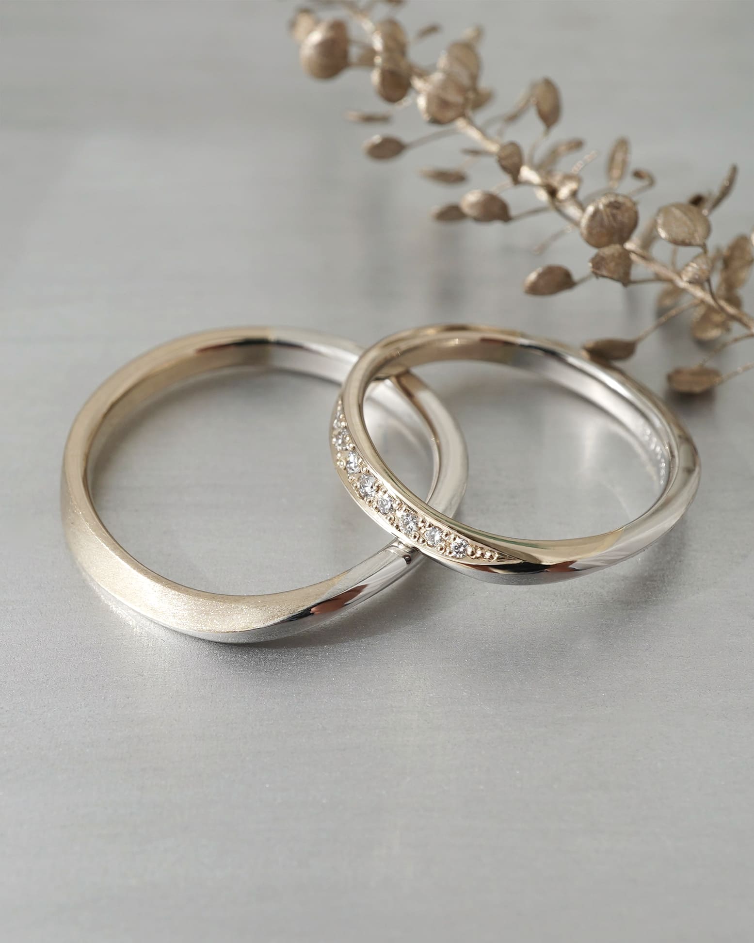 そよ風の空気感を表現した結婚指輪 太陽の光に照らされて、心地よい風が吹いているよう 中央ラインのシルエットは細身です 左右に向けてワイドな幅になります 見た目は細身の指輪デザインです